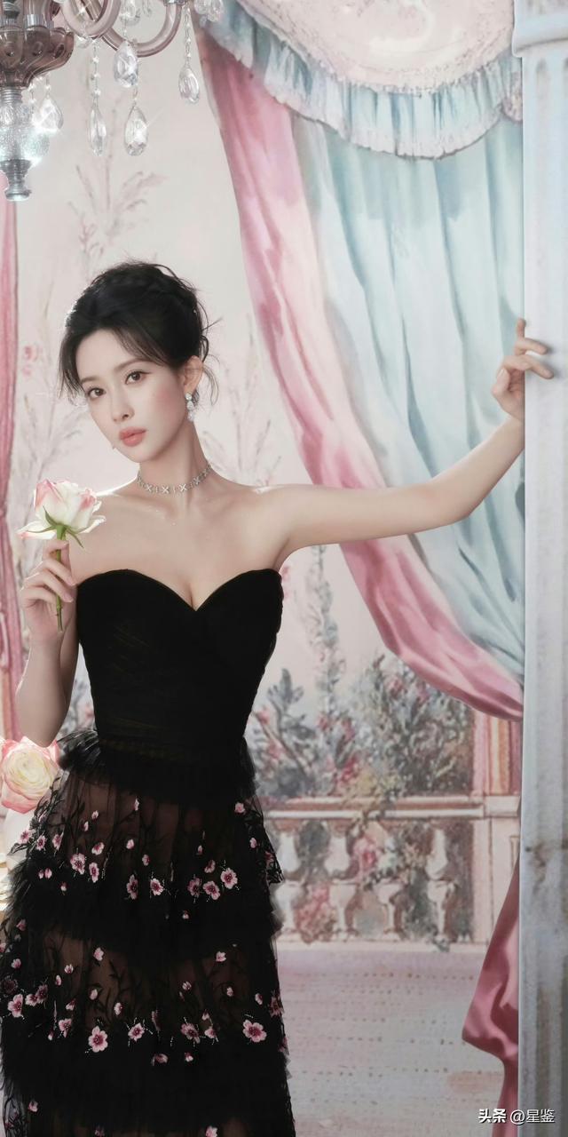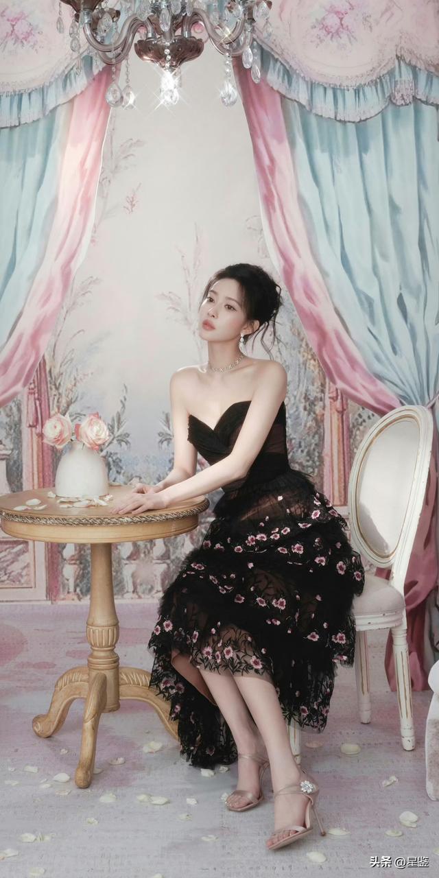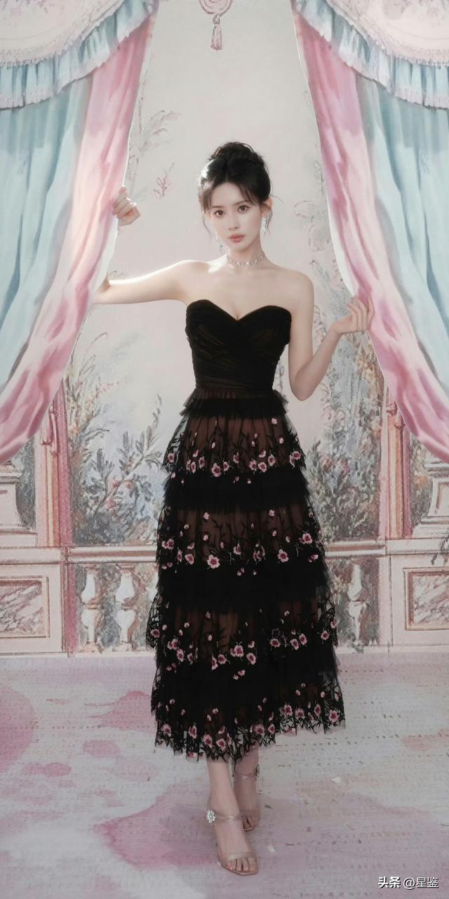 她选的这件黑色抹胸蛋糕纱裙是核心亮点:抹胸设计刚好露出肩颈线条,衬得锁骨和直角肩格外优越,又不会显得轻浮;层层叠叠的网纱裙摆带着朦胧透视感,上面绣满粉白小碎花,瞬间中和了黑色的沉闷,甜而不腻,酷而不冷。